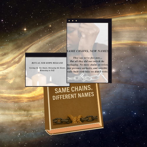 This work is a spiritual and strategic tool. A breakdown of the systems we’re tied to—and a rise into liberation, alignment, and ancestral memory. This is not just a booklet. It’s a rite of awakening. A mirror for the bound, a sword for the ready, and a light for those preparing to lead in the new world. Here, we call each rope by name. And then we release it—with ritual, clarity, community, and fire. The old chains are still here.